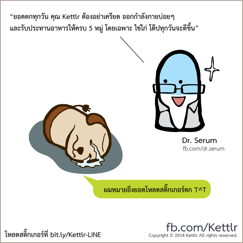 Dr.Serum: “ยอดตกทุกวัน คุณ Kettlr ต้องอย่าเครียด ออกกำลังกายบ่อยๆ และรับประทานอาหารให้ครบ 5 หมู่ โดยเฉพาะ ไข่ไก่ โด๊ปทุกวันจะดีขึ้น”