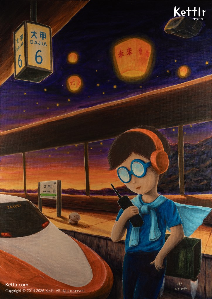 A high-speed train rushes toward Taipei while the evening sky above Dajia Station fills with drifting lanterns. Between the urgency of travel and the quiet of the platform, Akira pauses. The scene captures a fleeting moment suspended between movement and stillness — a place where departures begin and time seems to hesitate.